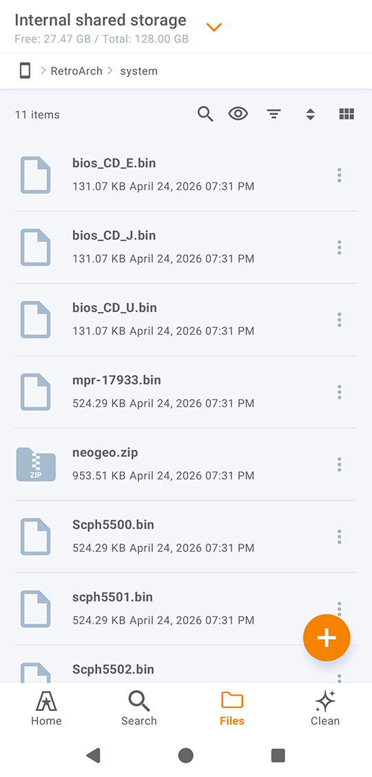 - If you have your Android device plugged into your computer, simply copy over the BIOS files to the RetroArch's “system” folder. The RetroArch folder will be there in the initial list of folders when you first open your phone.