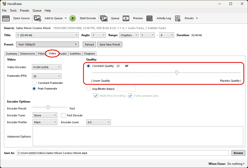 - This step is optional. You can change the video quality to be higher or lower. Click the “Video” tab. By default, the quality is set to “22”. That's a good point for an above-average quality video. If you want the video compressed to a smaller size, you can try setting the quality to “30” or even “35”. HandBrake doesn't give you an estimated file size for the converted video, so playing around with this video quality slider is guesswork.