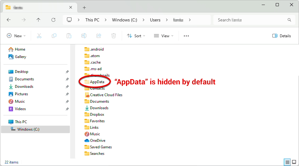 - Go to Windows (C:) > Users, then open the folder for the Windows profile you're currently signed into. If that sounds Chinese to you, the name of your Windows profile is probably your first name or your nickname. You'll see a folder like this .