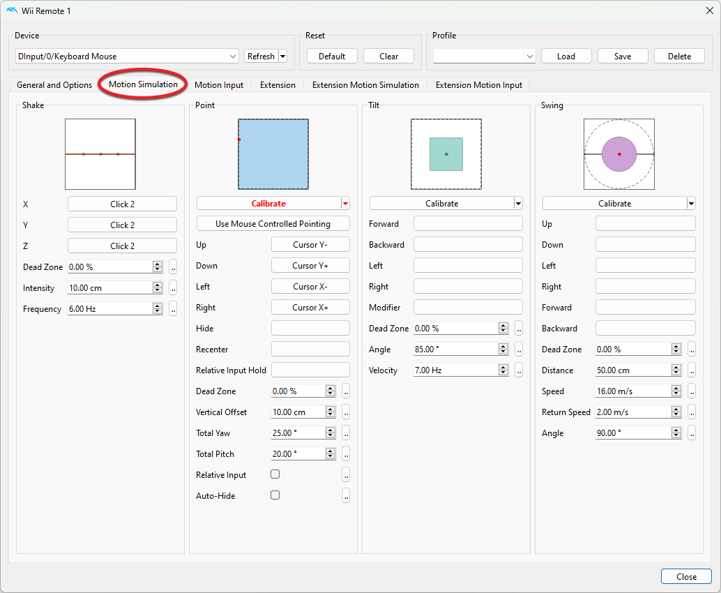 - Next, you may want to reconfigure the motion control for the Wii Remote (if you don't want to use your mouse). That's found by clicking on the Motion Simulation tab. Take notice of the “Point” area: