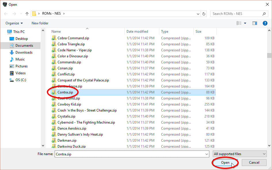- Navigate your computer to the folder where your NES ROMs reside. Click on the game you want to play, then click Open - as shown here .