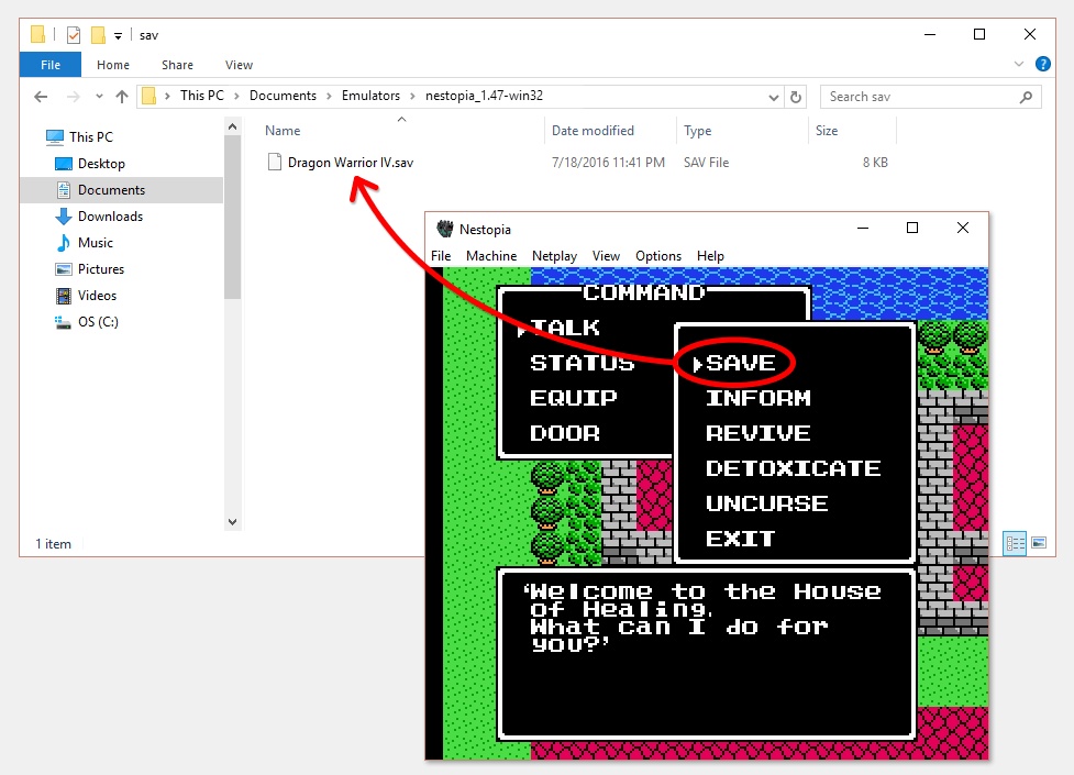 - Saved RAM: This is the internal save in RPGs. They have an SAV file extension. View this for a clearer picture . SAV files are what can be transferred to other NES emulators. You can literally just copy & paste the ROM and the SAV file over to the other NES emulator and it'll pick it up. Although some NES emulators want to be organized. They require you to dump the SAV file in a designated saves folder. I have a Game Saves Tutorial where you can learn more about transferring saves. You could also learn about using somebody else's saves.