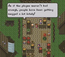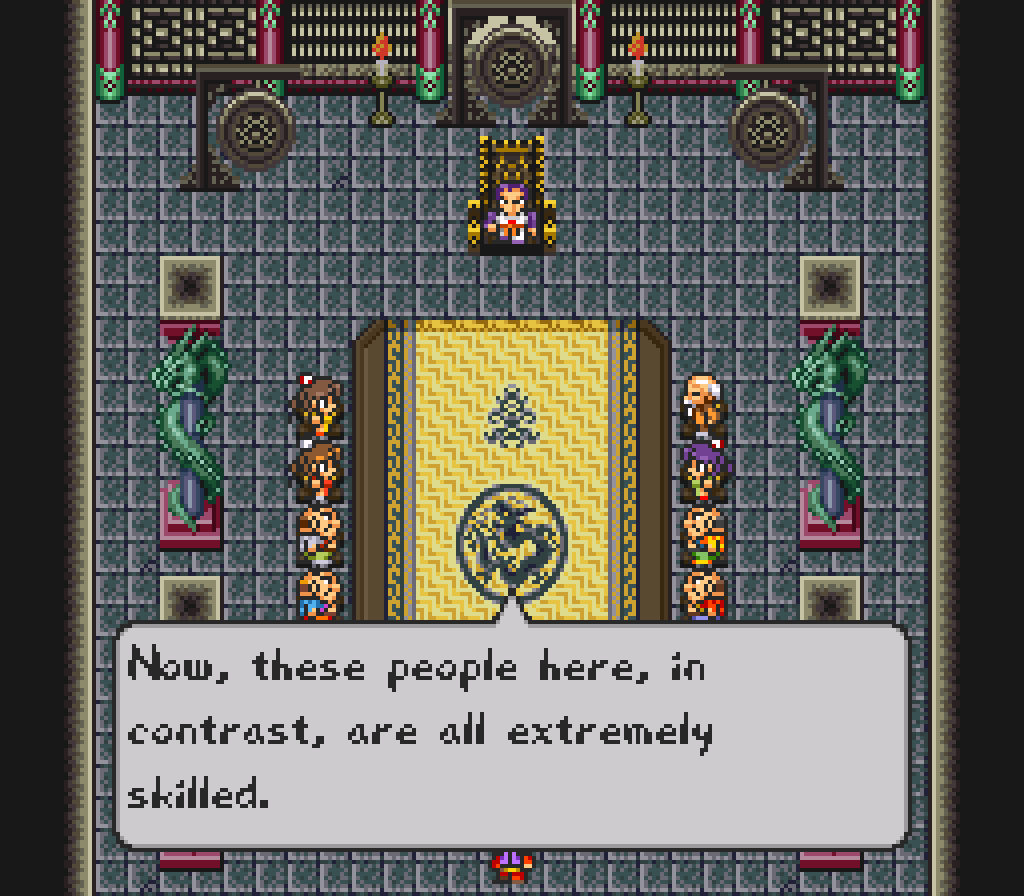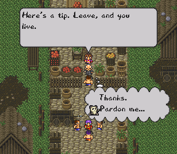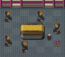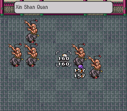 This is Xin Shan Quan. I like this chapter. The playable characters consist of the old guy and three fighters in training. The storyline is about a monk who wants teach someone his fighting techniques before they die off with him. Then an evil clan gets involved, etc. He goes off to fight the evil clan after some dramatic events. The last battle is probably the hardest in Live-A-Live. See that very last screen shot with all the people at the table? Square decided to leave all of this chapter's bosses for the final battle! It's an interesting challenge, eh? |